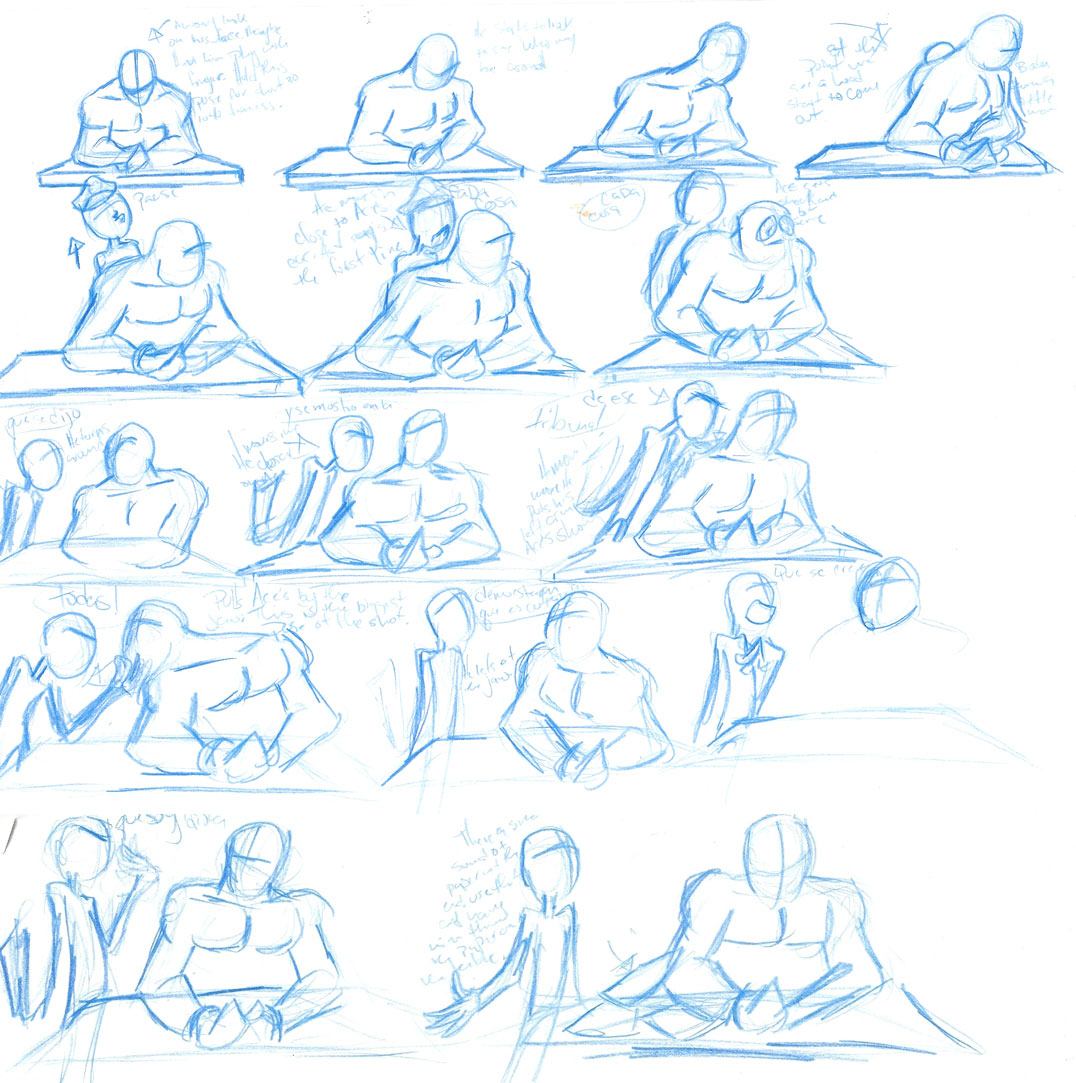 Next I write the dialogue and then break it down phonetically. I didn't use much reference for this shot. I use reference if I have a very difficult body mechanics shot or if it's something new that I have never animated before. At this point I start to draw out my thumbnails just to get my ideas down on paper. The drawings are not in detail and mostly are just key poses. I also like to make notes on my thumbnails of my ideas.