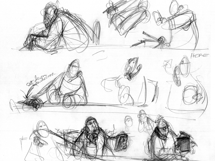 • I work on my model of the character, sometimes building the head out of clay so I know what he looks like from any angle. I also will be making doodles in my sketchbook, shooting photo/video ref, studying movies, etc.