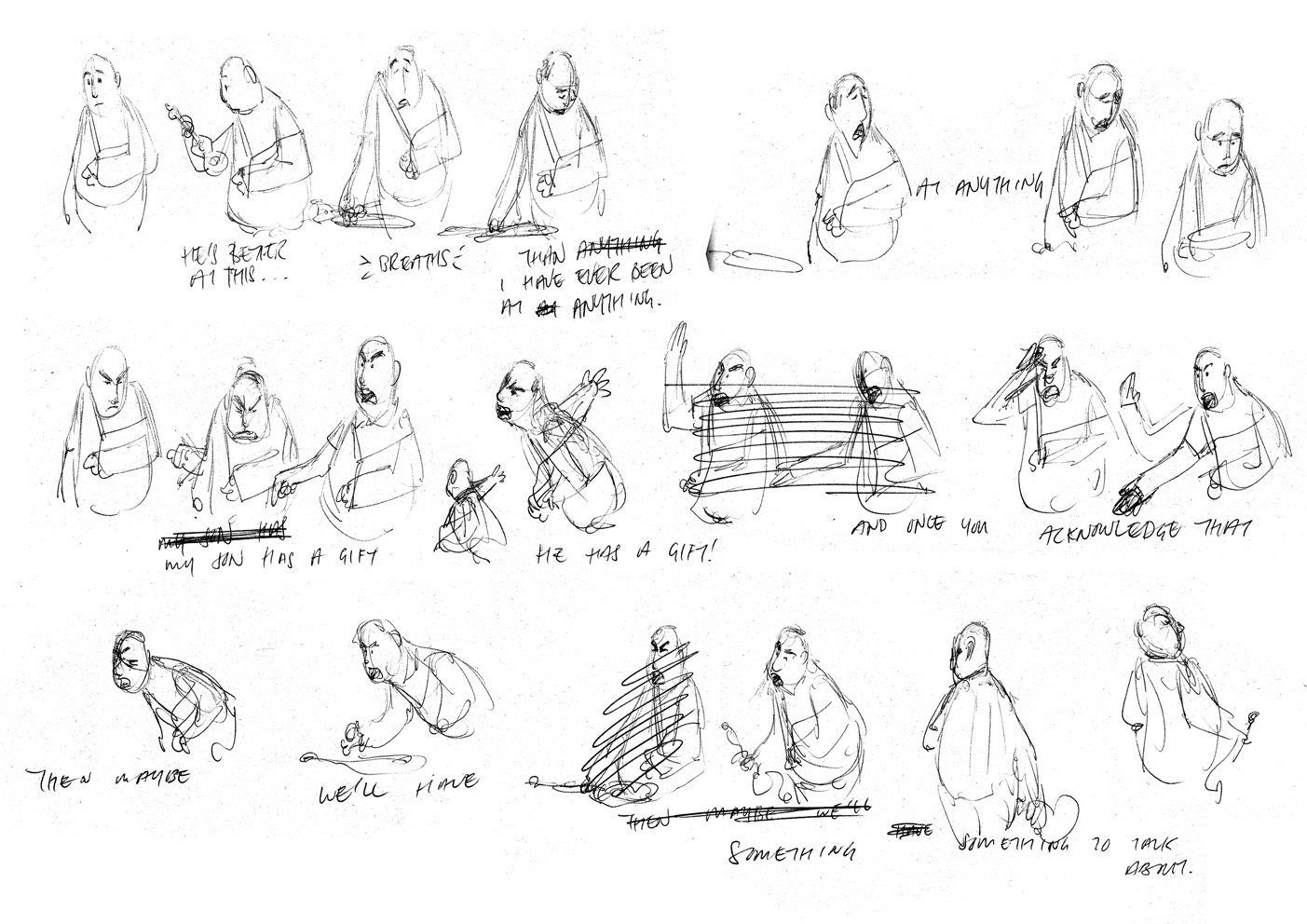 I think it might be better for me to talk specifically about the animation process for this piece. I first played the given audio on loop for a couple of minutes. After the first few cycles, snippets of the performance began to take shape in my head. I then quickly thumbnailed all the gestures that Herbert would make, relying very much on gut feeling to do so I think it might be better for me to talk specifically about the animation process for this piece. I first played the given audio on loop for a couple of minutes. After the first few cycles, snippets of the performance began to take shape in my head. I then quickly thumbnailed all the gestures that Herbert would make, relying very much on gut feeling to do so.
