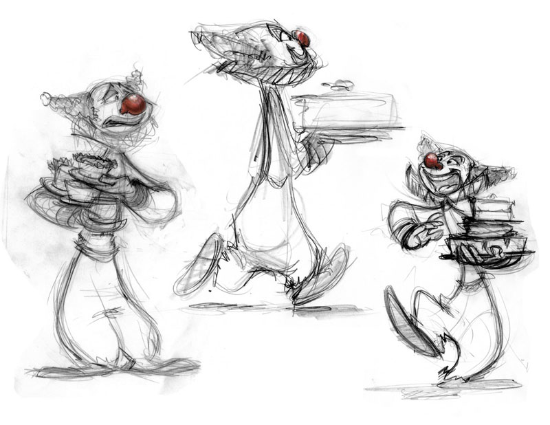 The Maitre D' stands in the same pose the entire scene. Did you ever intend to animate him, or did you construct his pose (and wonderful "snooty" facial expression) to be one that would read as a still character while the clown took center stage?